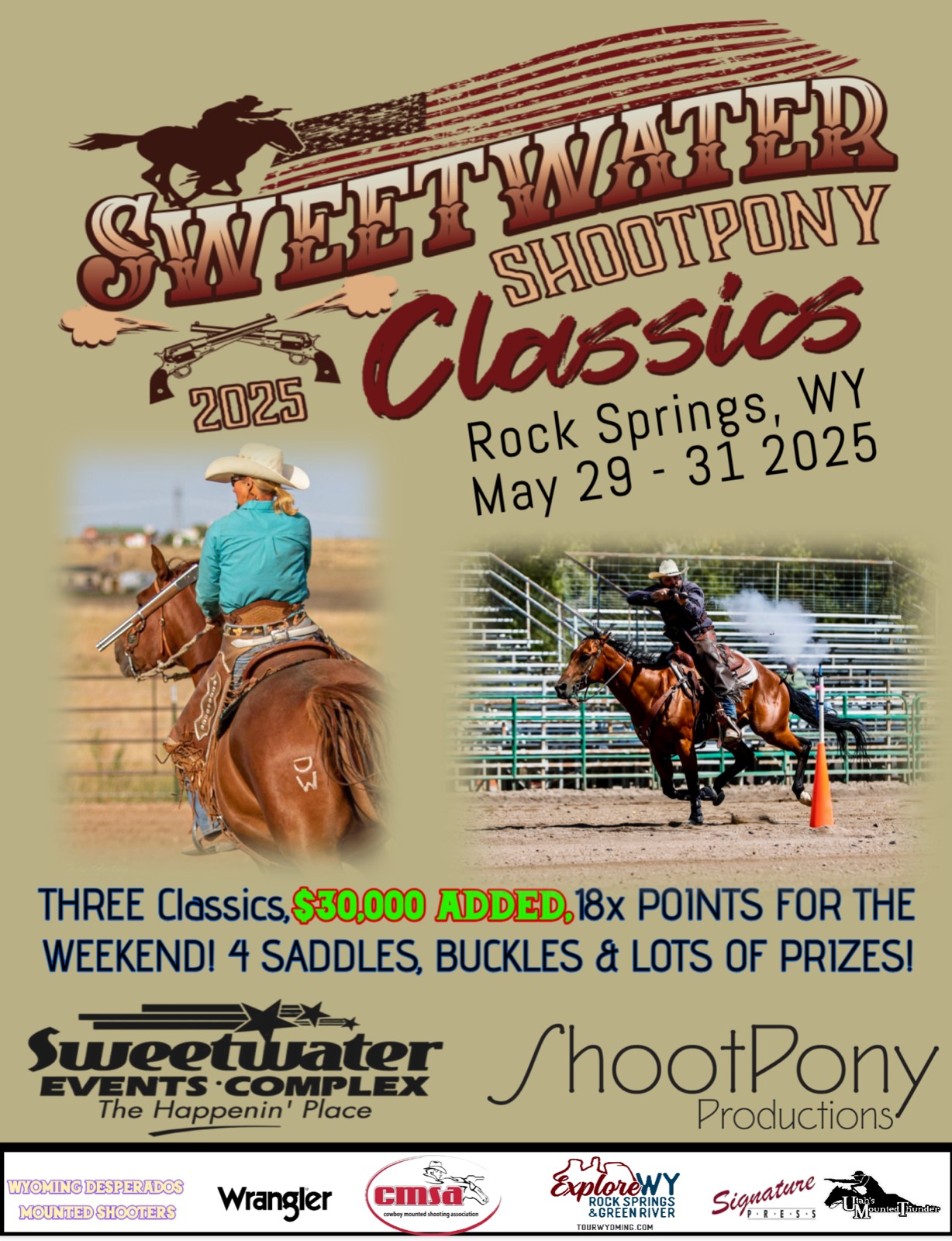 $30,000 ADDED 18X POINTS FOR THE WEEKEND! 4 SADDLES & LOTS OF PRIZES! THURSDAY: $10,000 ADDED CLASSIC 6X POINTS! 3 Stage Main Match $2,000 Added to Class Payback 2 Stage Shotgun 2 Stage Rifle 50% Payback in Classes, Rifle and Shotgun $8,000 Added in ShootPony 4D. Pays per stage. Must be Clean. All shooters automatically entered in the ShootPony 4D. Extra Horses Welcome and Encouraged - Run after MM horses each stage FRIDAY $10,000 ADDED CLASSIC 6X POINTS 3 Stage Main Match 50% Payback in Classes $2,000 Added to Class Payback $8,000 Added in ShootPony 4D. Pays per stage. Must be Clean. All shooters automatically entered in the ShootPony 4D. Extra Horses Welcome and Encouraged - Run after MM horses each stage SATURDAY: $10,000 ADDED CLASSIC 6X POINTS 3 Stage Main Match 50% Payback in Classes, $2,000 added to Classes $8,000 Added in ShootPony 4D. Pays per stage. Must be Clean. All shooters automatically entered in the ShootPony 4D. Extra Horses Welcome and Encouraged - Run after MM horses each stage AVERAGE AWARDS!! SHOOTPONY 4D Average calculated from Thursday and Friday combined in 1D, 2D, 3D and 4D. 1st Place in Each D Wins a Beautiful Saddle thank to Wyoming Tourism Board and Sweetwater Events Complex! Saddles and all average prizes will be awarded Saturday night following the Showcase.
