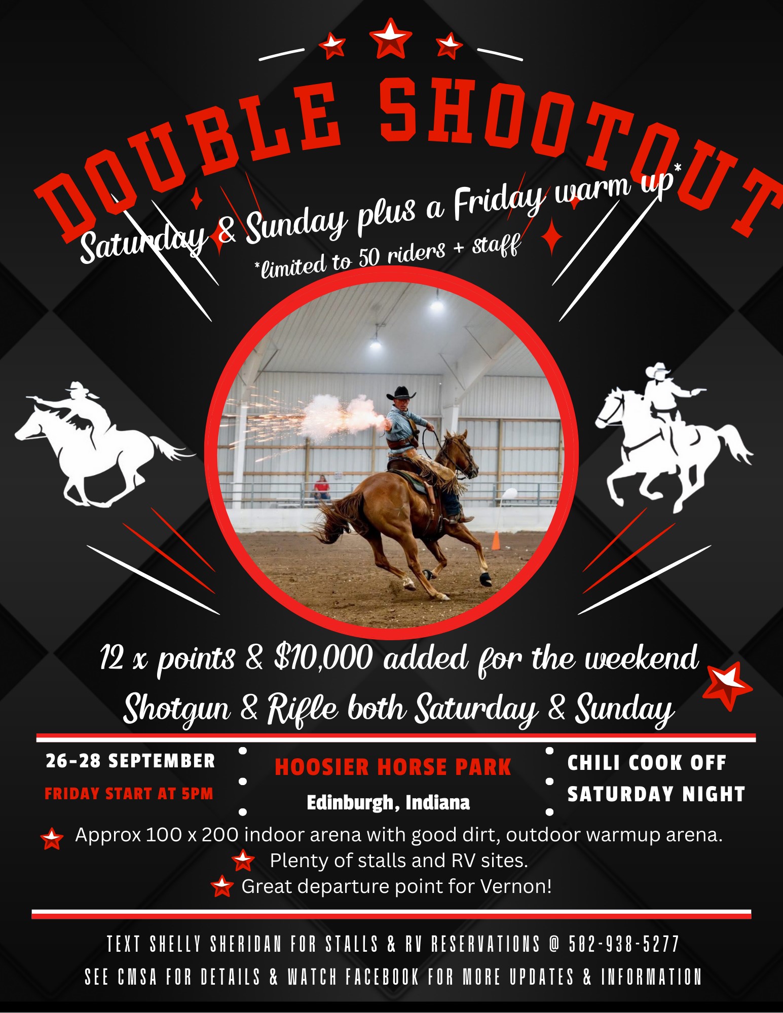 Kentucky Rangers SHOOTOUT #1 September 27th 2025 Hosted by the Kentucky Rangers Hoosier Horse Park Edinburgh,IN Kentucky Rangers SHOOUTOUT #1 Main Match SATURDAY Safety Meeting at 8:45 am Saturday First Shot 9:00 AM Saturday (Level 1- 6) 3 Stages Long Guns to follow directly after MM (Shotgun/ Rifle/ Cavalry/ Rifle/ Shotgun) Office Hours: 6:30-7 AM Saturday 6:30-7 AM Sunday Entry Fees: Main Match: $90 + $35 office fee AQHA: $125 Wranglers (Open): $35 Wranglers (Limited): $25 Clean Shooter: $25 Rifle: $65 Shotgun: $65 Cavalry: $65 3D Jackpot: $10 per stage Stage 1 - 1 second Stage 2 - 2 seconds Stage 3 - 3 seconds Overall Payback: $800: $200 Overall Open Cowboy/ $200 Overall Open Cowgirl/ $200 Overall Limited Cowboy/ $200 Overall Limited Cowgirl Stalls: Please text Shelly Sheridan to reserve 502-938-5277 $70 Weekend (+ 1 bag shavings) **stalls must be cleaned before leaving** $40 per night (+ 1 bag shavings) **stalls must be cleaned before leaving** $25 per extra night $70 Tack stall Weekend (+ 1 bag of shavings) $20 stall cleaning fee (Optional) **stalls must be cleaned before leaving** $9 extra bags of shaving $15 Day tie out (No horses tied overnight) Must check in at office before putting horses in stalls. *** If you are coming in after office hours please text or call Josh Kight 256-675-6000*** Electric hookup (with water): Please text Shelly Sheridan to reserve 502-938-5277 $70 Per Weekend Friday Night through Sunday Afternoon $40 one night only $35 each additional night (for early arrivals or late departures) No Charge for dry camping. Very clean shower house on the grounds. *** If you are coming in after office hours please text or call Josh Kight 256-675-6000*** CHECK KENTUCKY RANGERS FACEBOOK FOR UPDATES!!!!