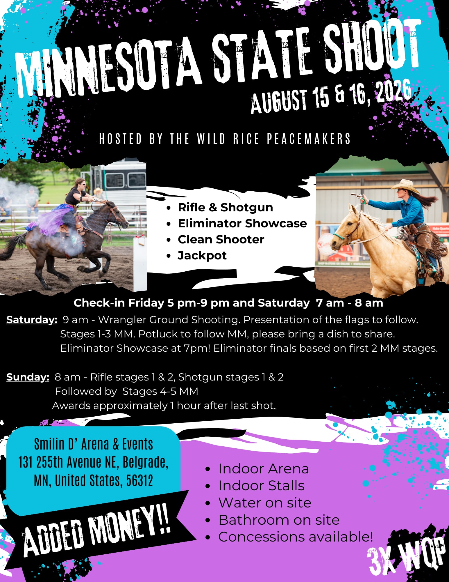 2026 MINNESOTA STATE SHOOT is a 3X WPQ on a 5-stage match over two days with shotgun, rifle and eliminator hosted by the Wild Rice Peacemakers. ** NEW LOCATION!! The 2026 Minnesota State Shoot will be held at Smilin' D Arena in Belgrade, MN! This is an indoor arena with indoor stalls, full bathrooms, concessions and spectator seating. ** https://smilindarena.com/about/about-arena-specs/ Order of events (Office hours are approximate): Friday, August 14th Move-in allowed after 12pm. Office will be open at the crow's nest for entries from 5-9pm Saturday, August 15th The office will be open from 7-8am. You must be signed up and paid by then to compete. NO changes to entries after 8am. Shooters Safety Meeting - 8:30 am Wrangler Ground Shooting (10 balloons) - 8:40 am Presentation of the flags to follow ground shooting Main Match: Stages 1-3 starting at 9 am 7 pm: Eliminator Showcase! $500 added by Smilin' D Arena Potluck to follow Main Match - Please bring a dish or dessert to share! Meat will be provided. We will be having the potluck between MM and the Eliminator Showcase. Sunday, August 16th Rifle Stages 1 & 2 Shotgun Stages 1 & 2 Main Match: Stages 4-5 following final rifle stage Awards - Approximately 1 hour after the last shot. Fees for the weekend: Main Match: 5 stages, entry fee: $150 - Level paybacks (NO senior splits) Wrangler Main Match: $30 Rifle: 2 stages, entry Fee: $45 - Class Paybacks Shotgun: 2 stages, entry Fee: $40 - Class Paybacks Eliminator - $50 entry fee Limited (1-3) Cowboys & Cowgirls Open (4-6) Cowboys & Cowgirls NO senior splits Qualifier for the eliminator will be overall times from stages 1-3 of the main match, and taking back the top 5 Cowboys and Cowgirls in each division. Clean Shooter: $10 entry fee - 100% payback split between all shooters with no penalties. Overall Jackpot: $50 entry fee - 3D or 4D dependent on number of entries. Other Fees/Details: Ammo: Whitehouse and Curly's Office fee - $10 Dry Camping: $30/weekend - No Electrical Hookups Stalls: $45/stall, shavings are $11/bag. Stalls have concrete floors. Please contact Katie for your stall reservations and if you would like to be stalled near specific individuals. NO PORTA PENS ALLOWED. No outside shavings. Stalls do NOT need to be cleaned before leaving. Bathroom On-Site. Multiple water hydrants on site. Match Directors: Katie Pulford (218) 671-8753 Sara Herrmann: (612) 272-9312 Dan Herrmann: (651) 230-5784